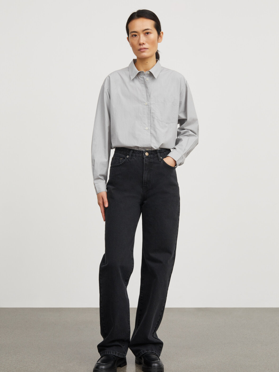 - Lange ærmer med knaplukning på manchetterne